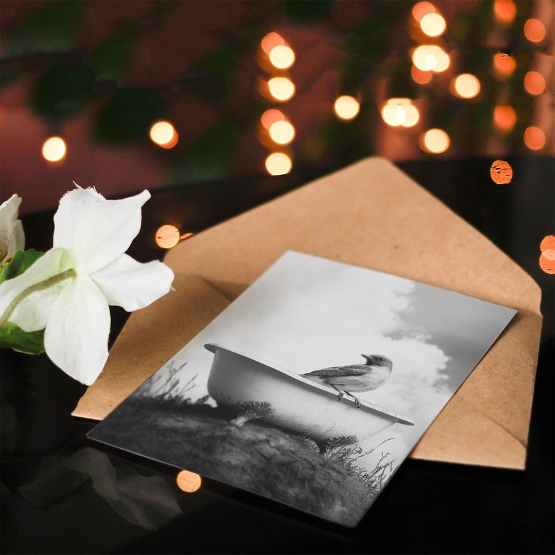 Artery8 Greeting Card Sparrow on Elegant Bathtub Black White Surreal Blank For Him Or Her Art Birthday Card