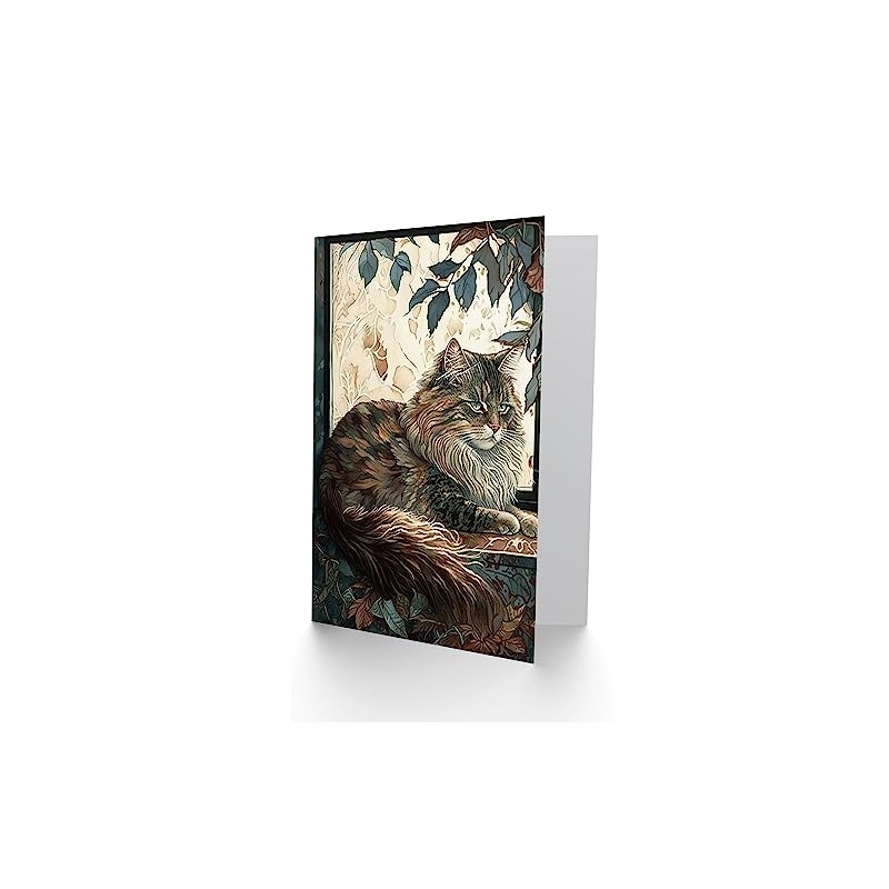 Artery8 Siberian Cat Perched on Window Sill in Autumn Modern Illustration Art Birthday Sealed Greeting Card Plus Envelope Blank Inside