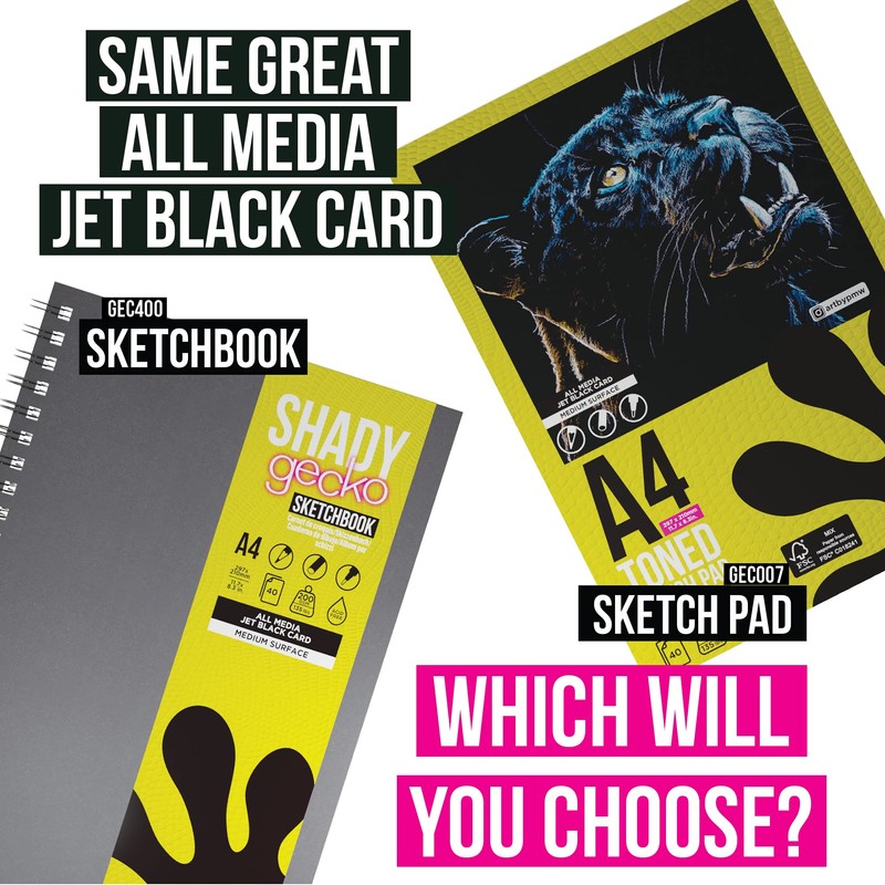 - A4 sketchbook containing 40 sheets of 200gsm, acid free, premium jet black card with a medium surface - making it suitable for a variety of techniques including chalk and pastel.