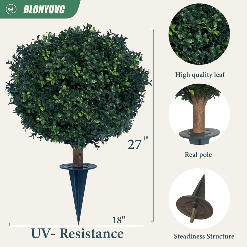 kyesyes Artificial Boxwood Ball Bush 27" Tree UV Resistance Rated with Spike. Easy to Push in The Ground.Plant Looks Great in a Planter Anywhere. Indoor/Outdoor Decor 2 Pack