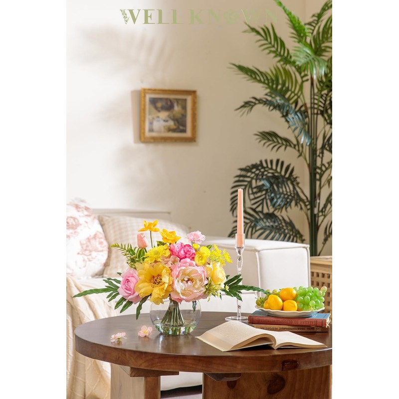 - 【Mixed Species Fake Flowers Bouquet】The real touch yellow, pink and hot pink peonies mixed with pink and Chanpagne roses, pink PU Tulips, yellow daffodil and green leaves, making a beautiful flower bouquet for expressing everlasting and refresihing bright visual to your space with realistic and natural looking.