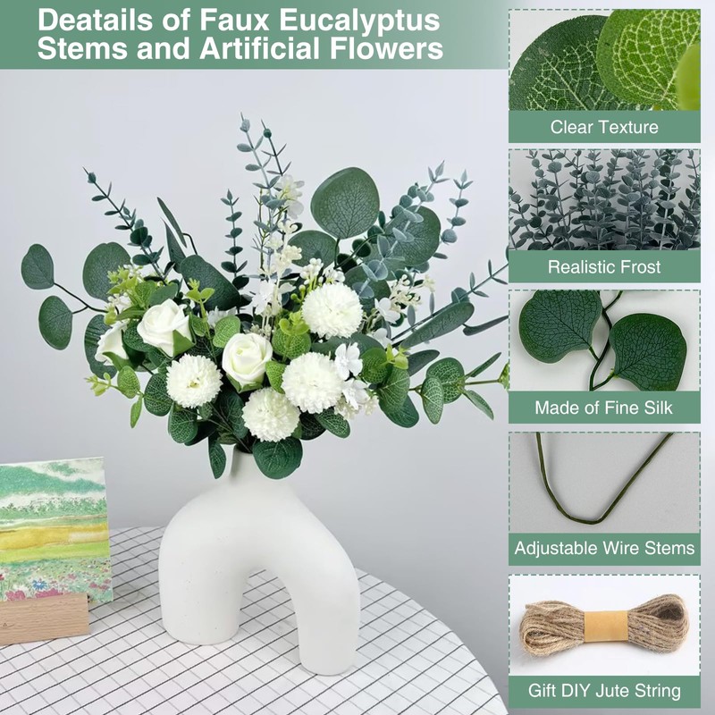 - Premium Greenery Branches: Our artificial eucalyptus leaves and flowers are mainly made of quality silk and plastic. The stems are made of iron wire wrapped with green floral tape, you can bend or cut them and wrap the bouquets with the included jute string as needed