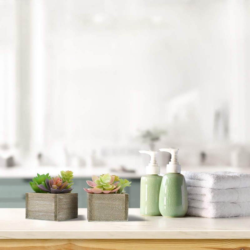 - [Realistic Modern Design] Faux succulents in pots with vivid color and exquisite workmanship for a realistic look and give you a realistic feel when you touch them. They are the perfect simple greenery to liven up any space with the wooden potted decor plants.