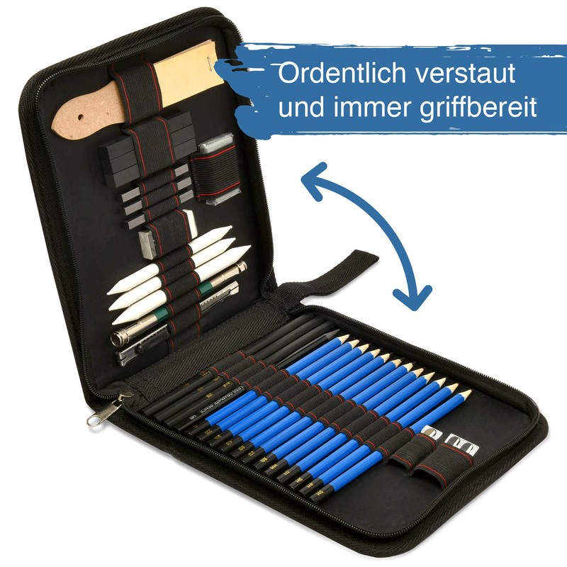 - With tear closure – In the case with the dimensions of approx. 24 x 20.5 x 3.5 cm, you can neatly store all the painting utensils of the pencil drawing set. In addition, the bag is equipped with a loop for handy transport. So you can use the pencil set for drawing on the go.