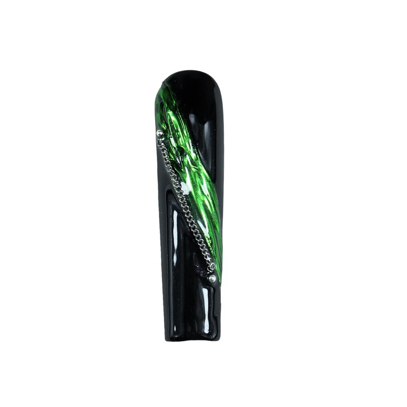 ArtiPrint Extra Long Black Square Press on Nails Handcrafted Metallic Green and Silver Chain Design Reusable Stick-On Nails,Trendy Futuristic Style Perfect for Parties and Special Occasions (L008, S)