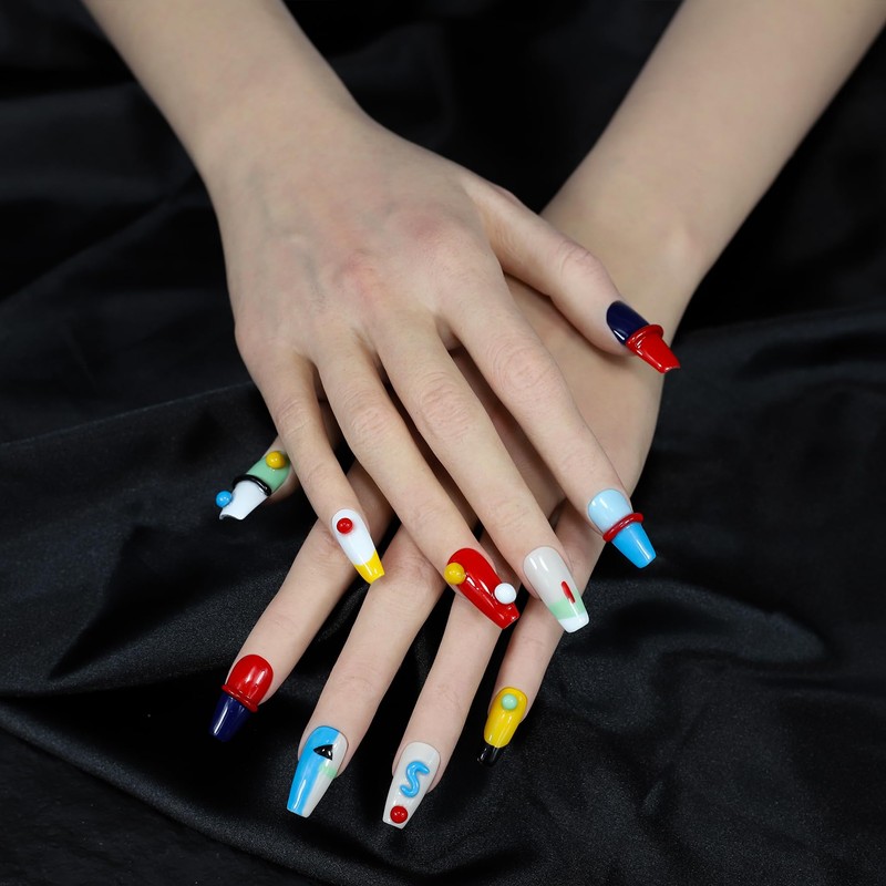 ArtiPrint Reusable Press-on Nails Geometric Patchwork with 3D Fun Cartoon,Easy to Apply & Remove, Safe for Your Nails for Women, Girls, for Daily Wear, Parties, or Casual Events (mk080, XS)