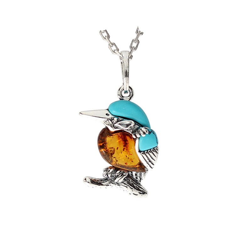 Artisana-Schmuck Amber Kingfisher Pendant (without Chain) Made of Amber and Reconstructed Turquoise, Set in 925/000 Sterling Silver, Baltic Amber Turquoise reconstructed 925/000 sterling silver, Amber