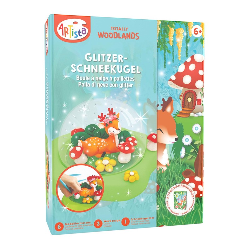 - Contents: 1 snow globe, 1 deer figure, 6 different coloured modelling compounds, 3 tools, 1 bag of glitter dust and instructions with illustrations.