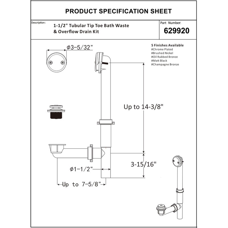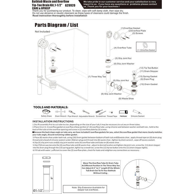 - BATH TUB DRAIN KIT: This bath drain kit includes everything necessary for installation, including 1-1/2” plastic tubular, bath drain waste and overflow horn elbow and tee, bath waste shoes, tip toe bath tub drain plug and bath overflow face plate & matching screws.