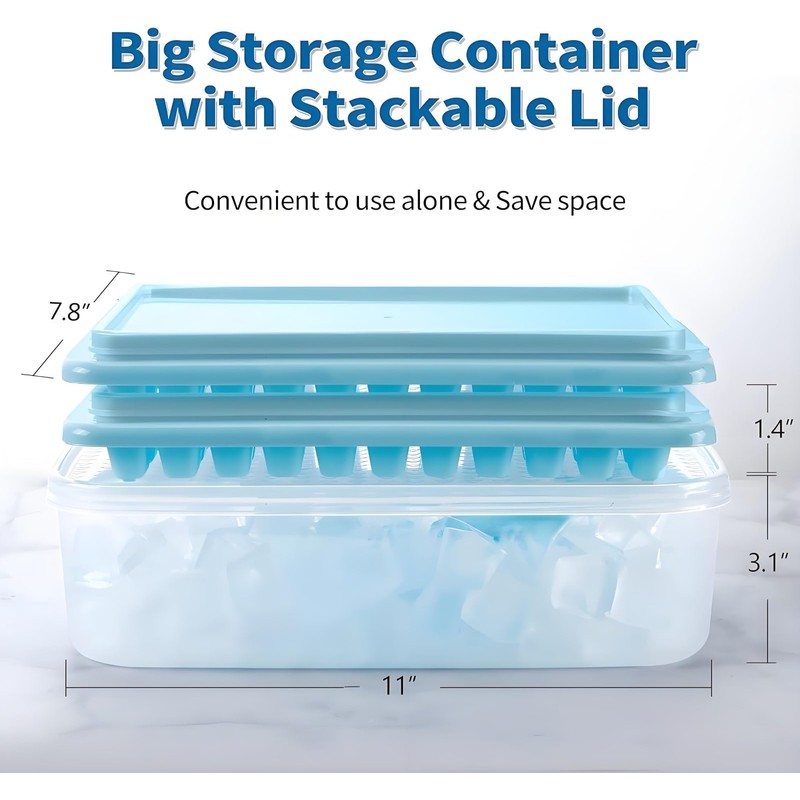 - Stackable Ice Tray with lid and Bin Combo - Compact freezer storage, fits nicely in Home Fridge freezer, RV refrigerator. This combo includes: 2 ice cube trays with lid, 1 storage container with lid, 1 ice scooper.