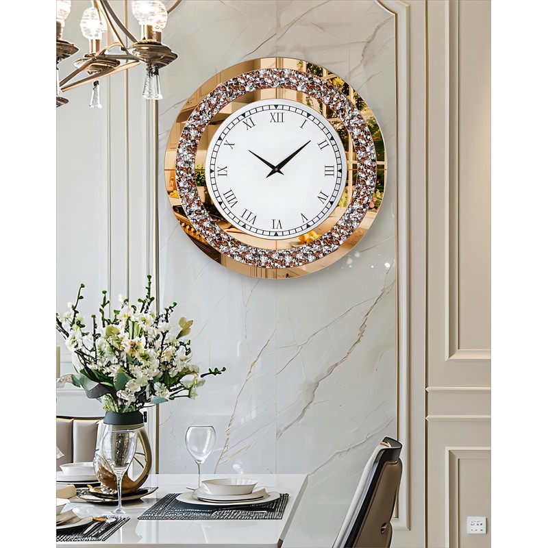 - Round Diamond Glass Mirror Clock - 24 inch crystal mirror with geometrically stereoscopic bling diamond shaped, tea-brown tinted mirror framing edge and roman digits clock.These simple but amazing design elements makes it easy to integrate into various scenes for living room, dining room, study room or hallway. Add some glamour and sophistication to the room space, A fusion of Art and Practicality