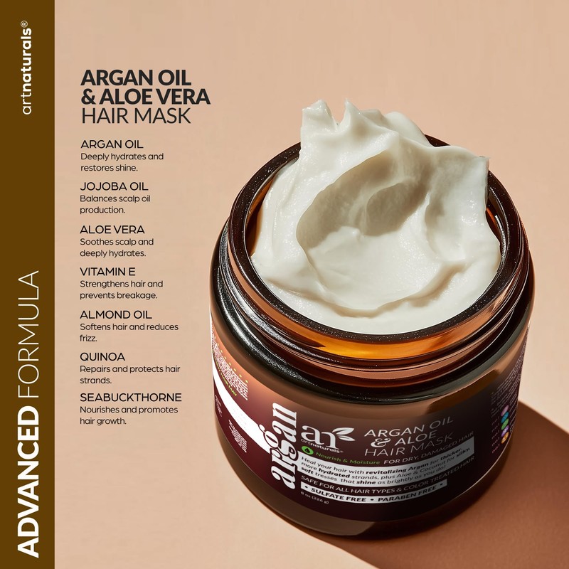 - ARGAN OIL HAIR MASK This powerful natural moisturizer has a reputation for keeping hair hydrated. It helps repair damaged, brittle, and dry hair caused by sun-exposure, blow-drying, and flat ironing
