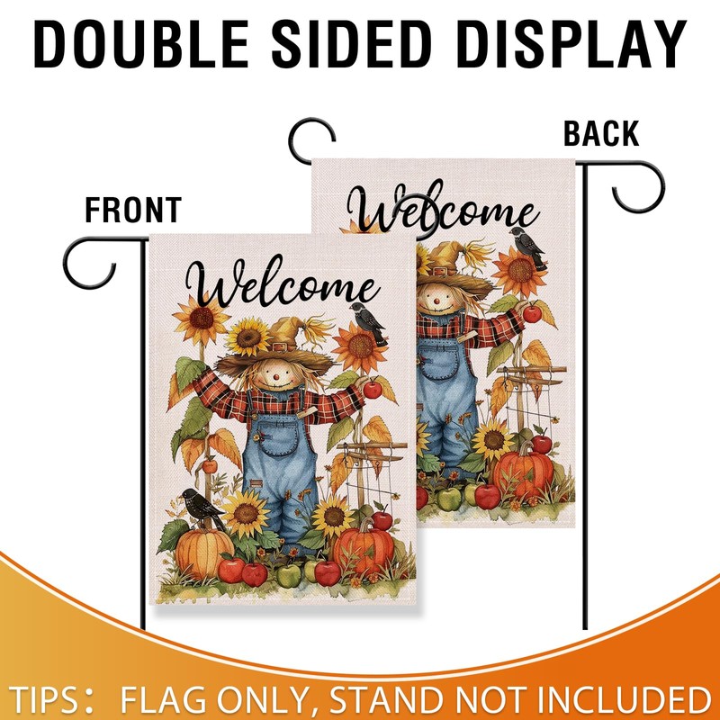 Artofy Welcome Fall Scarecrow Small Decorative Garden Flag, Autumn Harvest Sunflower Pumpkin Apple Yard Lawn Outside Decor, Thanksgiving Crow Burlap Outdoor Home Decoration Double Sided 12 x 18