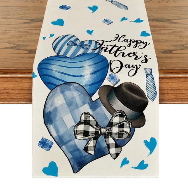 Artoid Mode Blue Heart Happy Father's Day Table Runner, Festival Kitchen Dining Table Decoration for Home Party Decor 13x72 Inch