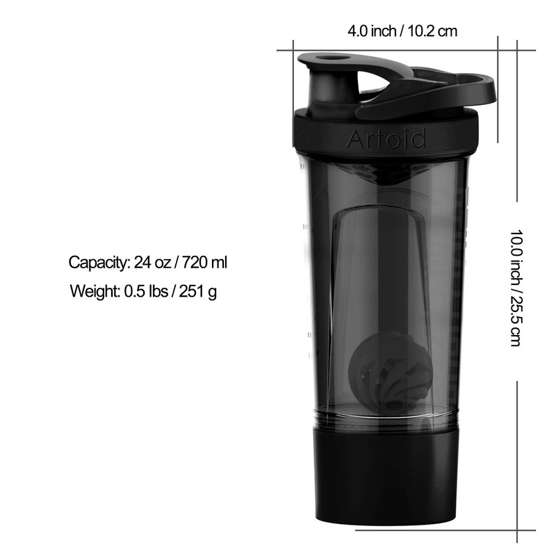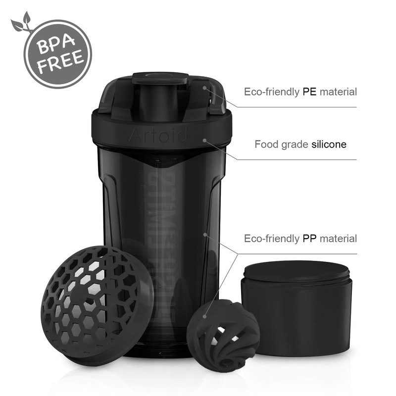 La botella agitadora Artoid de 720 ml pone fin a los agitadores apestosos con plástico sin olor y sin diseño de silicona. Con un lazo de transporte y una bola agitadora extraíble, también se puede utilizar como una botella de agua diaria.