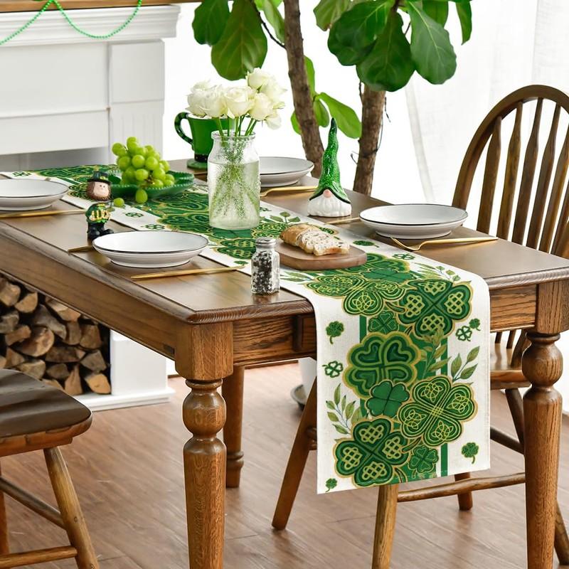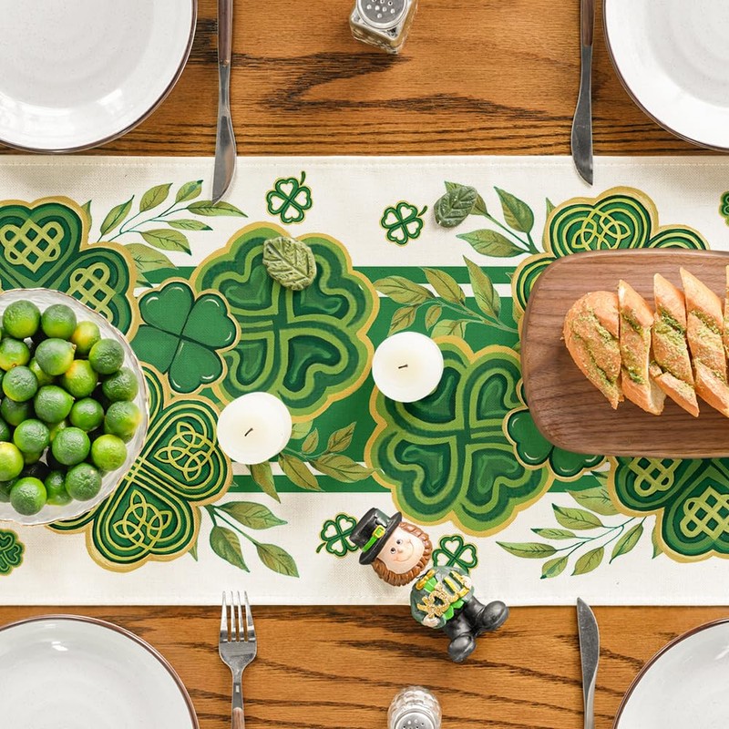 Artoid Mode Leaves Clover Shamrocks Stripes St. Patrick's Day Table Runner, Holiday Kitchen Dining Table Decoration for Home Party Decor 13x72 Inch