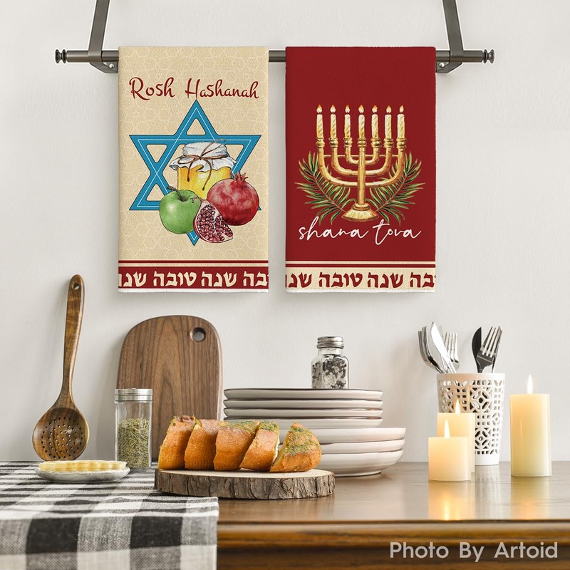 Artoid Mode Star Rosh Hashanah Kitchen Towels Dish Towels, 18x26 Inch Shana Tova Pomegranate Decor Hand Towels Set of 4