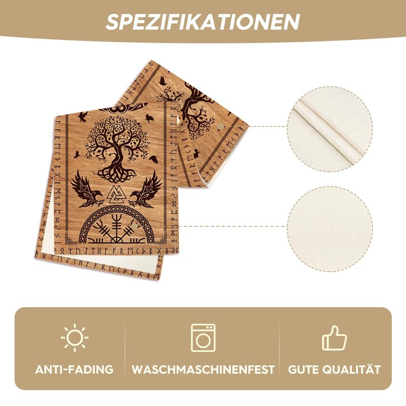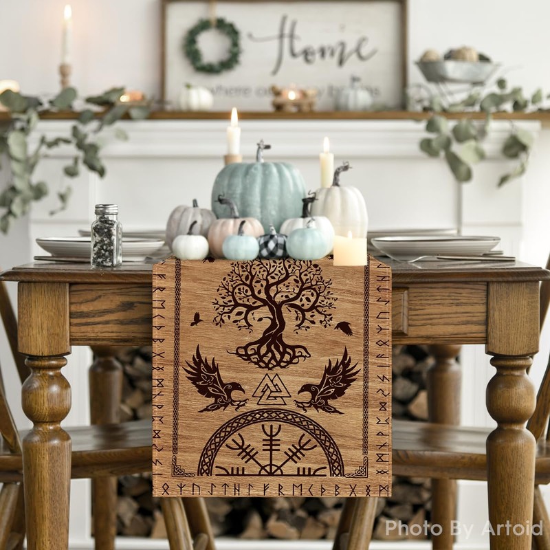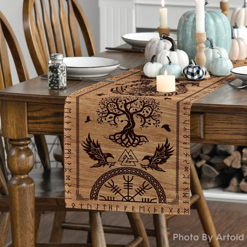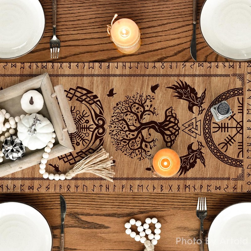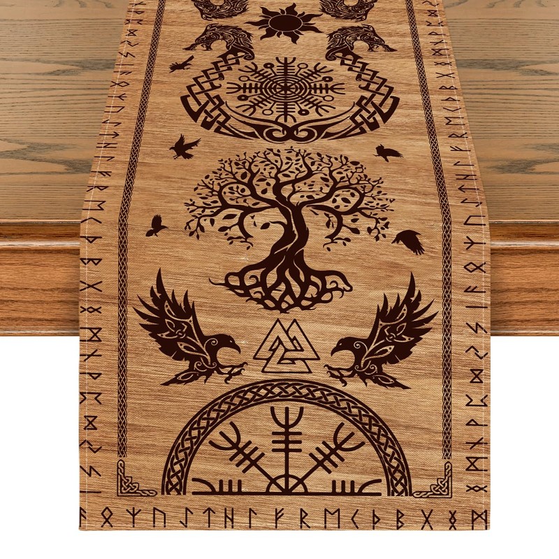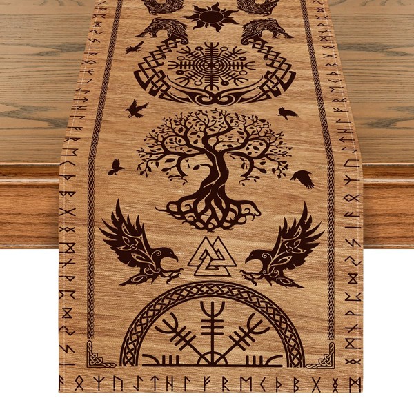 Artoid Mode Wooden Viking Tree of Life Raven Helmet of Awe Table Runner, Seasonal Table Decoration, Indoor, Holiday, Party Decor, 40 x 180 cm