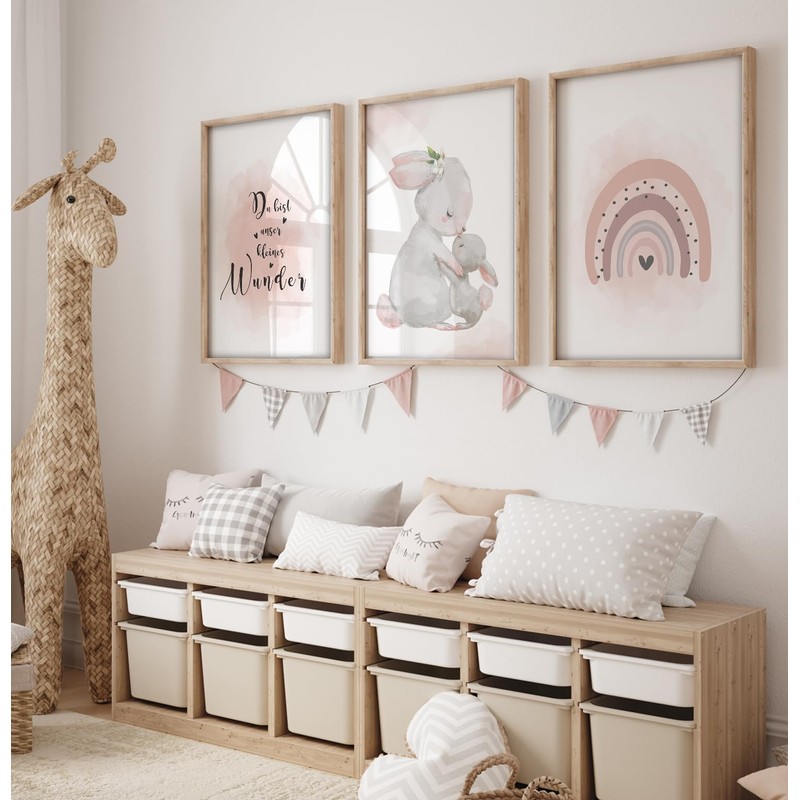 artpin® Children's Room Decoration Poster, A4 Pictures, Baby’s Room, Set of 3, Pink, Grey, for Girls, Rainbow, Rabbits (K5)