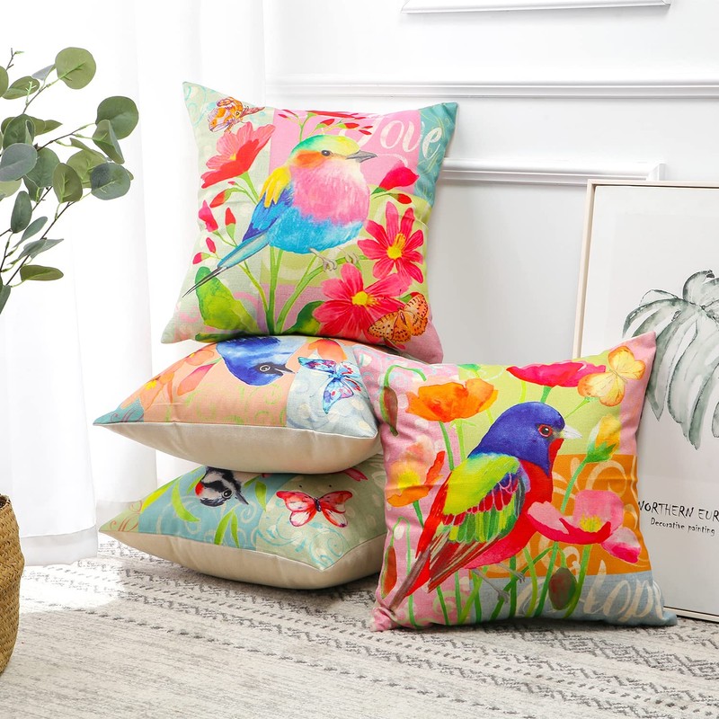 Artscope Set of 4 Waterproof Cushion Covers 45x45cm, Decorative Flower Bird Butterfly Throw Pillow Covers, Perfect to Outdoor Patio Garden Bench Living Room Sofa Farmhouse Decor