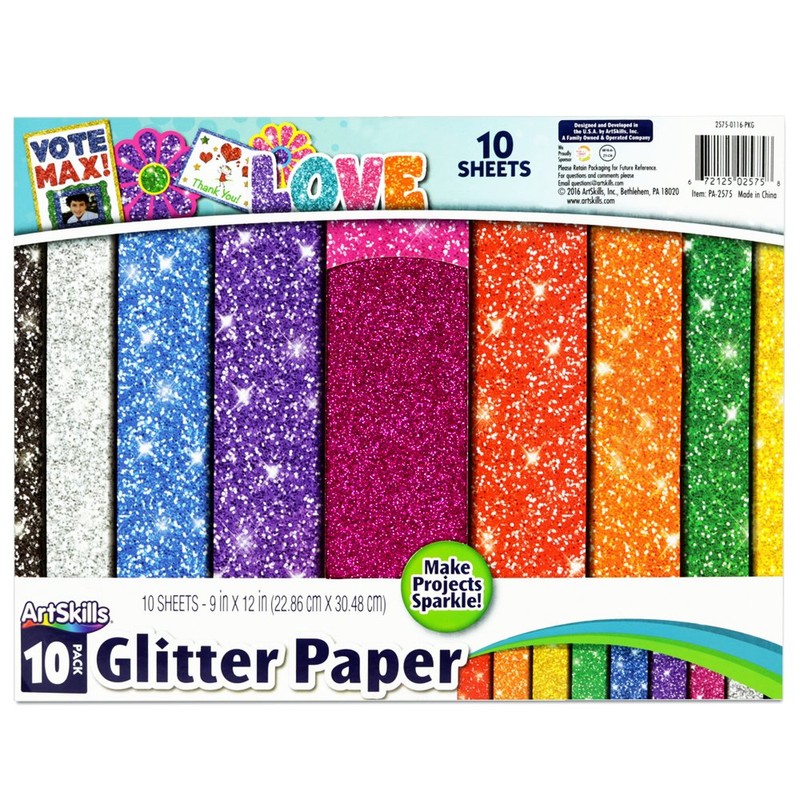 Easily create sparkling projects with ArtSkills Glitter Paper. This sturdy paper uses a real, ultra-fine, glitter coating on each sheet to provide a vibrant and eye catching decoration. The convenient paper pad allows you to find the page you want and store the rest for later in a drawer or supplies box. Use glitter paper to frame or back images and information, create fun paper crafts, and more! 1 sheet of each color: Black, Silver, Blue, Purple, Red, Orange, Green, Yellow, Plus 2 sheets of Pink. Each Glitter Paper Sheet measures 9" x 12"