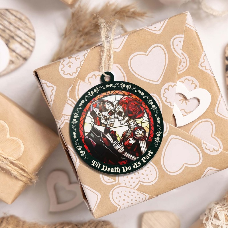 - 🎁 Gothic Skeleton Couple Design: The ornament showcases a gothic skeleton couple design that symbolizes love and unity in an alternative and unconventional style. The skulls represent the eternal bond between two individuals, while the gothic aesthetic adds an edgy and mysterious element. It's a perfect choice for couples who embrace gothic culture and have a unique sense of style.
