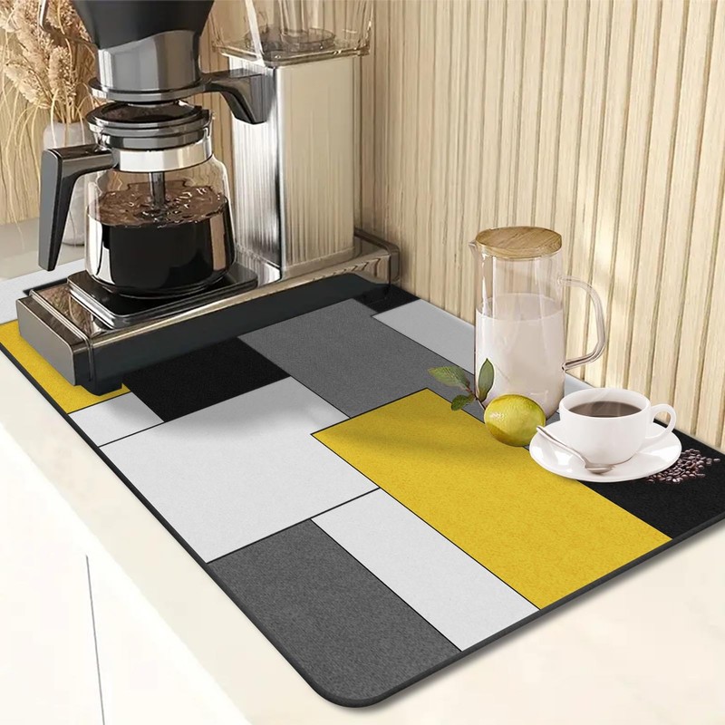 Arttown Coffee Mat for Countertops, Yellow Black White Grey Modern Dish Drying Mat 2 Pcs for Kitchen Coffee Bar Accessories, Fit Under Coffee Maker Espresso Machine Dish Rack Hide Stain Rubber 12x19in