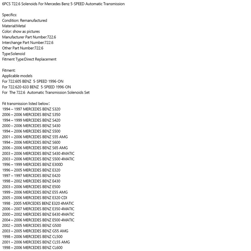 - Fit for Mer-cedes-Benz Models: This solenoid set is compatible with a wide range of for Mer-cedes-Benz models including S320, E320, S500, E500, CLK500, C280, C320, C350, and more from 1994 to 2007.