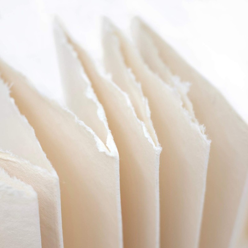 - Mid-rough surface texture, deckle edge, secured with an elastic strap and shipped with a wrapping of recycled kraft paper
