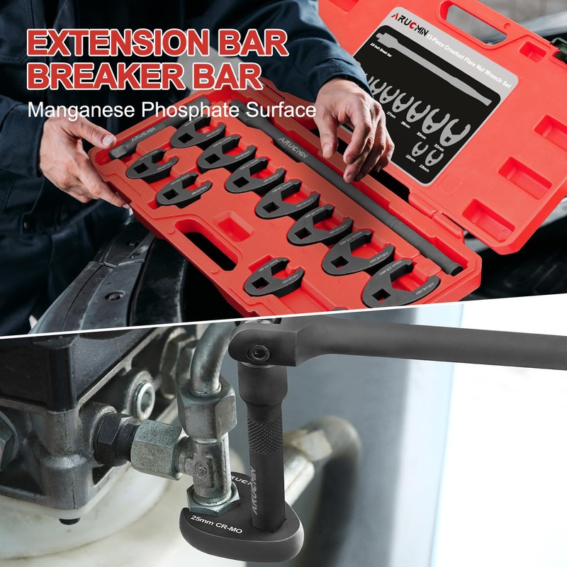 - 【13-PIECE METRIC】: 11 x Metric crowfoot flare nut wrenches: 20mm, 21mm, 22mm, 23mmm, 24mm, 25mm, 26mm, 27mm, 28mm, 30mm, 32mm.A 16-inch break bar, and a 5-inch extension bar are included as extras. Meet your daily work needs.
