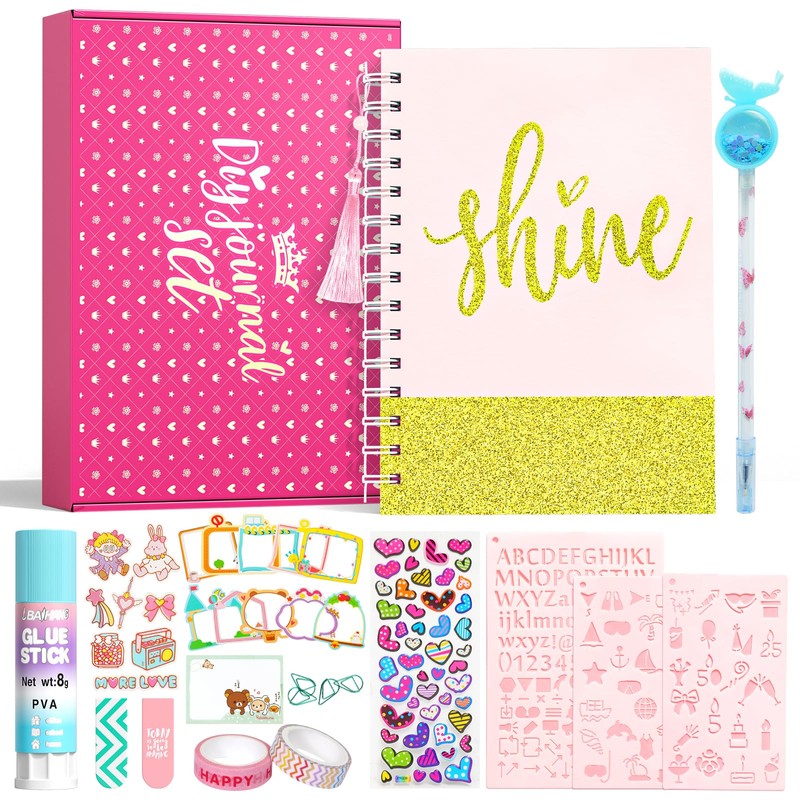 - [JOURNAL KIT FOR GIRLS] INCLUDES] 1 Journal Book (70 Sheets & 5 Styles Of Printed Pages & Size: 8.2x5.8inches), 1 Sticker Sheet (About 21-50 Die-Cut Heart Shapes ), 2 Color Decorative Tapes,1 Ballpoint Pen, 4 Paper Clips, 2 Magnetic Bookmarks, 10 Photo Frames, 1 Tassel Keychain, 1 Glue Pen,11 Cartoon Stickers, 3 Reusable Stencils,1 Sticky Note, The journal set is FOR GIRLS AGES 6+ . Encourage children to write down their thoughts, joyous, worries, goals, dreams, memories, and more.