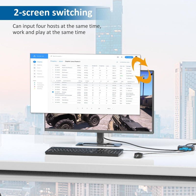 - Input: Max 2 PCs. Output: 1 VGA port and 3 USB2.0 ports. (such as Monitor and Mouse , Keyboard , Printer , Scanner , USB disk)