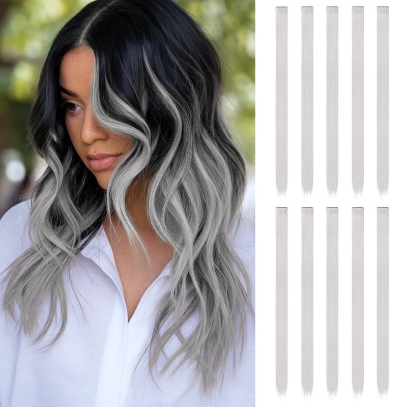 ARWIG 10 Pcs Clip In Hair Extension, 22 In Hair Extensions Human Hair Extensions Long Straight Hair Extensions clip in Hair Accessories for Girls (Gray)
