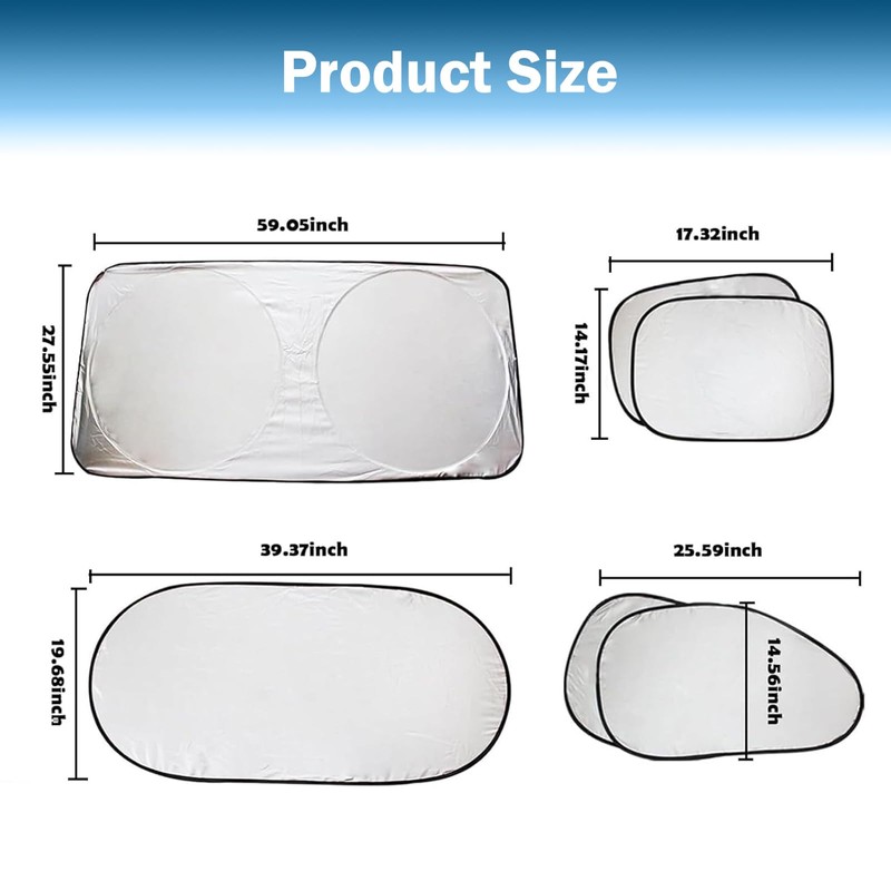 • Full Package Contents: Your purchase includes a full set of 6 sunshades, 2pcs for the front and rear windshields, and 4pcs for the side windows. Dimensions are as follows: front windshield is 59" x 27.5", rear is 39.3" x 19.6", front side windows is 25.5" x 14.5" , and rear side windows is 20" x 14.5" .