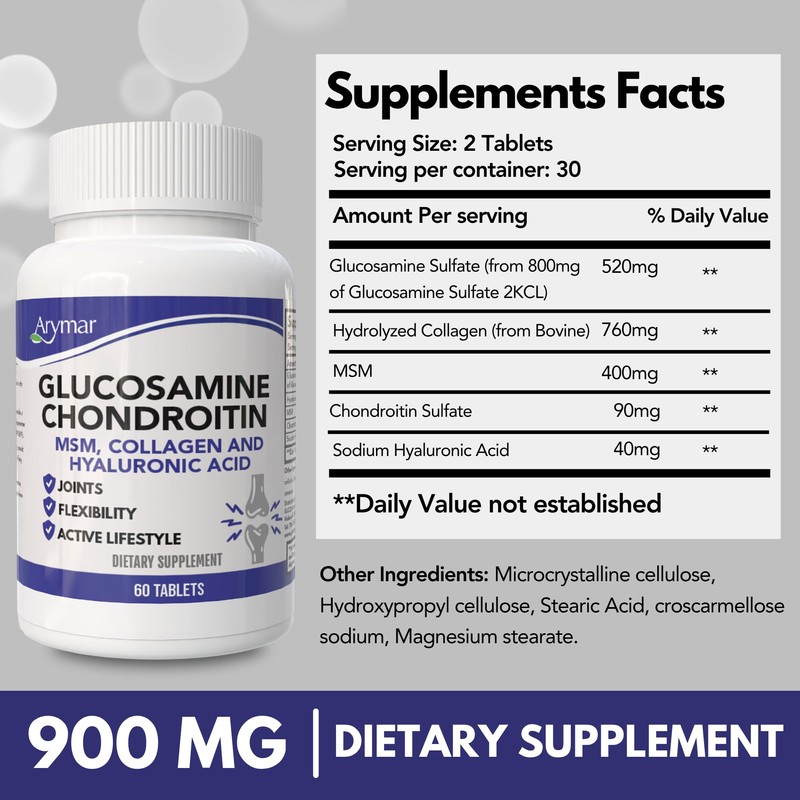 Arymar Glucosamine, Chondroitin, MSM, Collagen & Hyaluronic Acid Supplement 60 Tablets