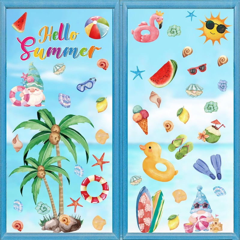 Aryroi Hello Summer Window Clings,Pool Beach Window Stickers,Gnome Wall Stickers,Summer Office Decorations,Watermelon Coconut Tree Decal for Glass for Home Room Classroom Party School Office