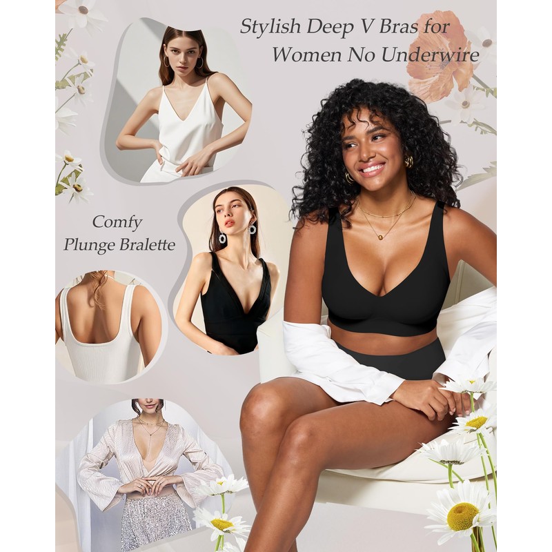 - Deep V Plunge Bralettes: Our comfort low cut v neck bra pefect for any clothes like t-shirts tops dress as everyday bra. The seamless Deep V bras are particularly friendly for spring summer fall when you wearing under low-cut tops and dresses. this bra hugs your curves flawlessly, offering zero gaps, slippage, or bunching for a silhouette as seamless as the ocean’s surface.