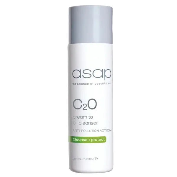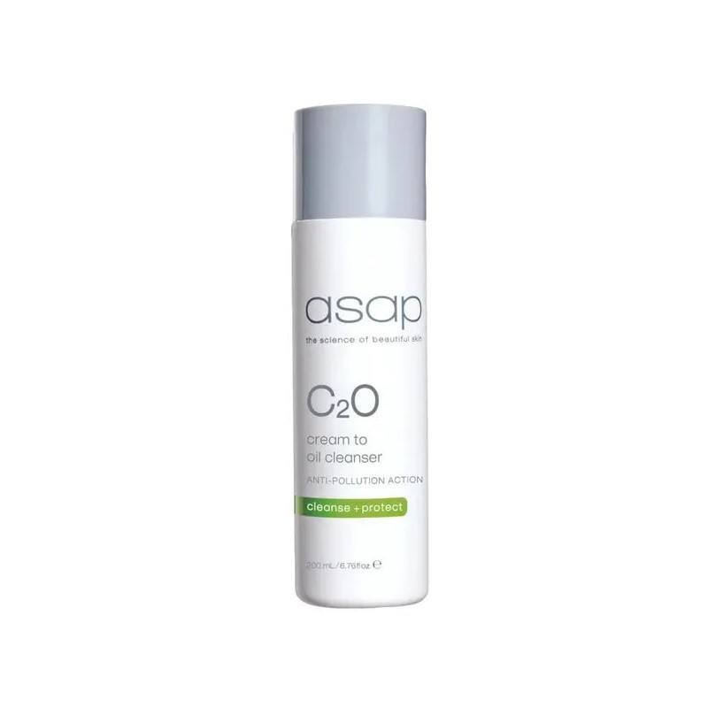 asap C2O cleanser transforms from a cream to an oil on the skin, offering a sensorial cleansing experience with a calming scent. It melts away makeup and removes environmental pollution, leaving skin clean and hydrated. Designed for a 30-second massage before rinsing, it’s formulated with plant-derived ingredients that nourish and balance the microbiome, helping to protect the skin barrier.