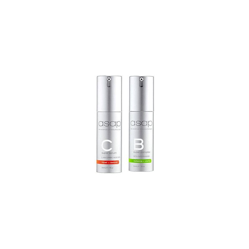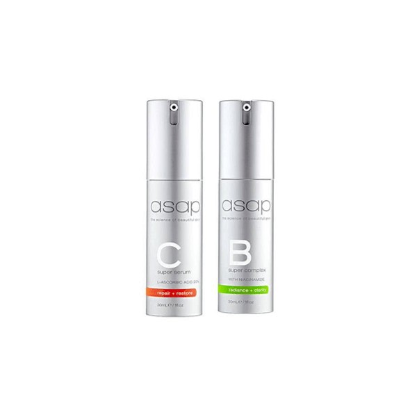 The asap Super B and C Complex 30ml Bundle includes the asap Super B Complex 30ml and the asap Super C Serum 30ml, which work together to protect the skin from pigmentation, environmental stress, reduce the signs of ageing and provide a bright, clear and even skin tone.