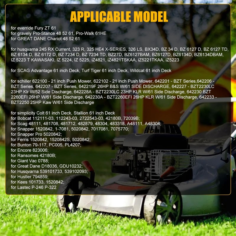 - Compatible with: Fit for EVERRIDE; Fury ZT 61; for GRAVELY; Pro-Stance 48 Pro-Stance 52 Pro-Stance 61 Pro-Walk 61HE; for GREAT DANE; Chariot 48 Chariot 52 Chariot 61; for HUSQVARNA; 245 RX Current 323 R 325 HE4 X-SERIES 326 LS BX34D BZ 27 BZ 27 D BZ 34 BZ 34 D BZ 6127 D BZ 6127 TD BZ 6134 D BZ 6172 D BZ 7234 D BZ 7234 TD BZ27D BZ6127BAM BZ6127D BZ6127DBAM BZ6127DBF BZ6134D BZ6134DBAM BZE 6127 D FOR BZE 6134 D BZE 6134 D FOR