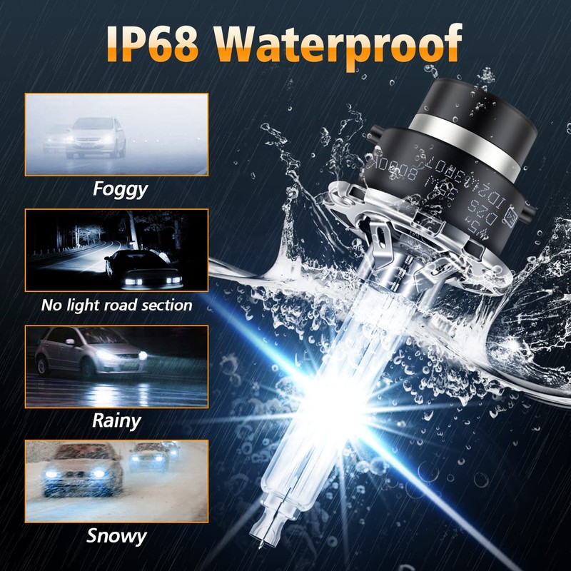 - 300% super brightness: 8000K ice blue, bluish white: driving vision clearer. 2*35W 3500 Lumens, 3 times brightness than original dim yellow car lamps, plug and play, easy to own extremely bright cool racing vision.