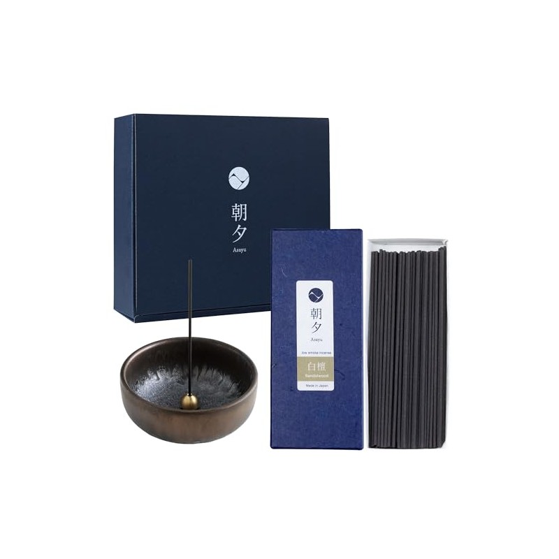 Asayu Japan Low Smoke Incense Gift Set, Made in Japan - Sandalwood Incense Sticks with Zen Ceramic Bowl and Brass Stand Holder