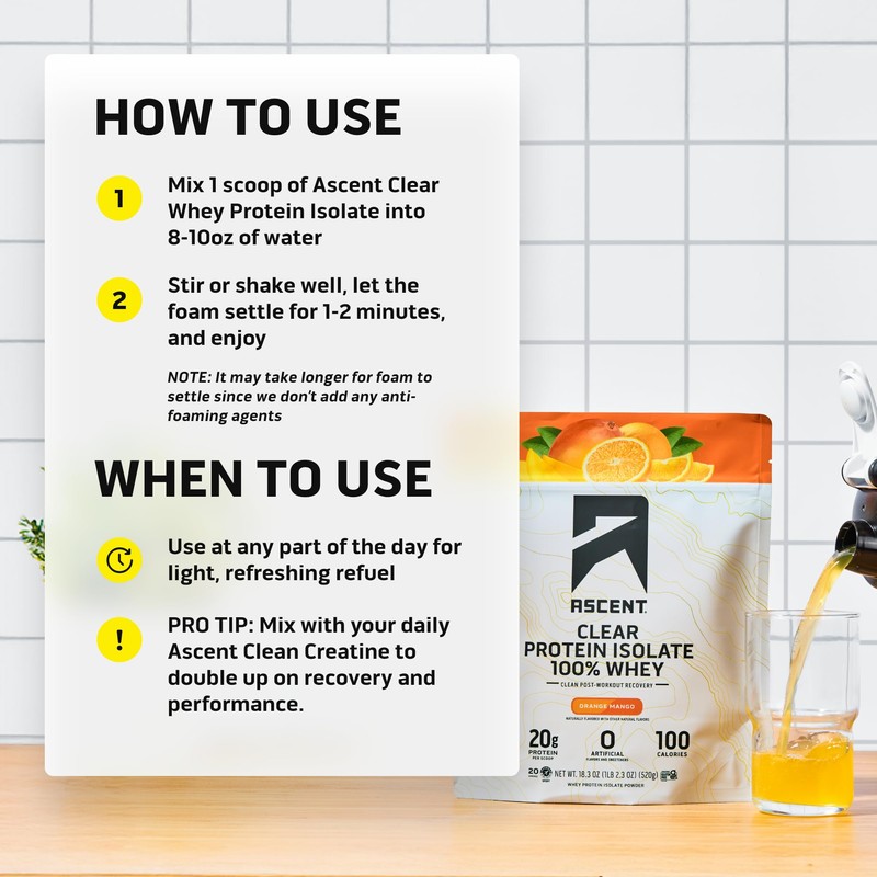 - Clear Whey Protein Powder - Light & Refreshing Recovery: With 20g of clean protein per serving, Ascents Clear Whey provides a lighter, refreshing alternative to traditional whey, perfect for post-workout recovery.
