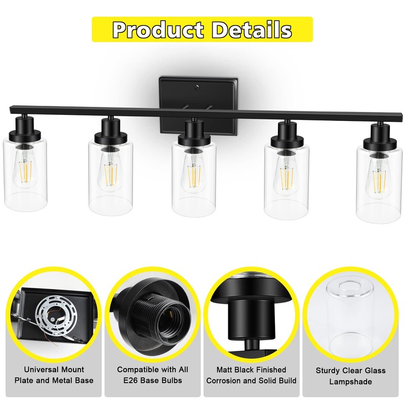 Ascher 5-Light 37.8" Wall Sconces, Modern Vanity Light Fixture with Clear Glass Shade, Black Finish Wall Light for Mirror Bedroom Hallway, E26 Base (Bulbs Not Included)