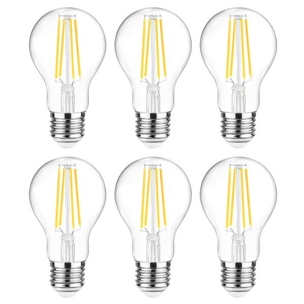 Ascher 60 Watt Equivalent, E26 LED Filament Light Bulbs, Daylight White 4000K, Non-Dimmable, Classic Clear Glass, A19 LED Light Bulb with 80 CRI, Pack of 6