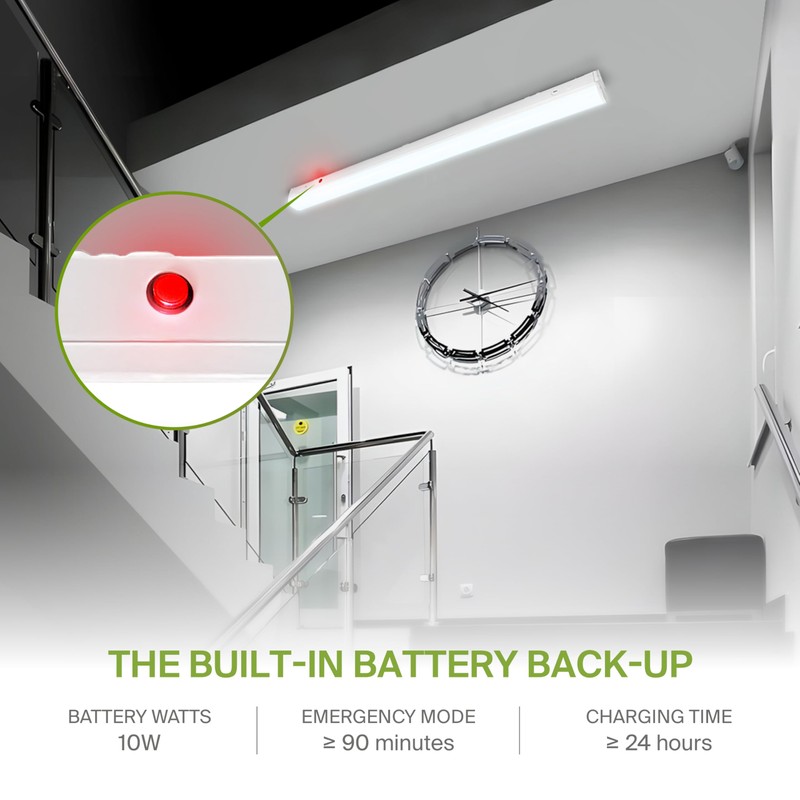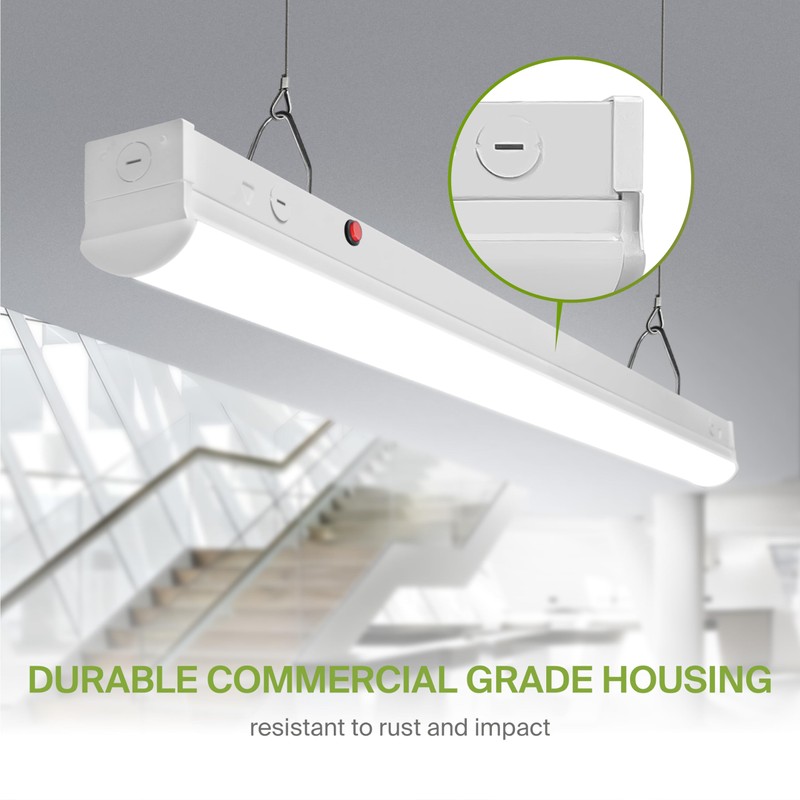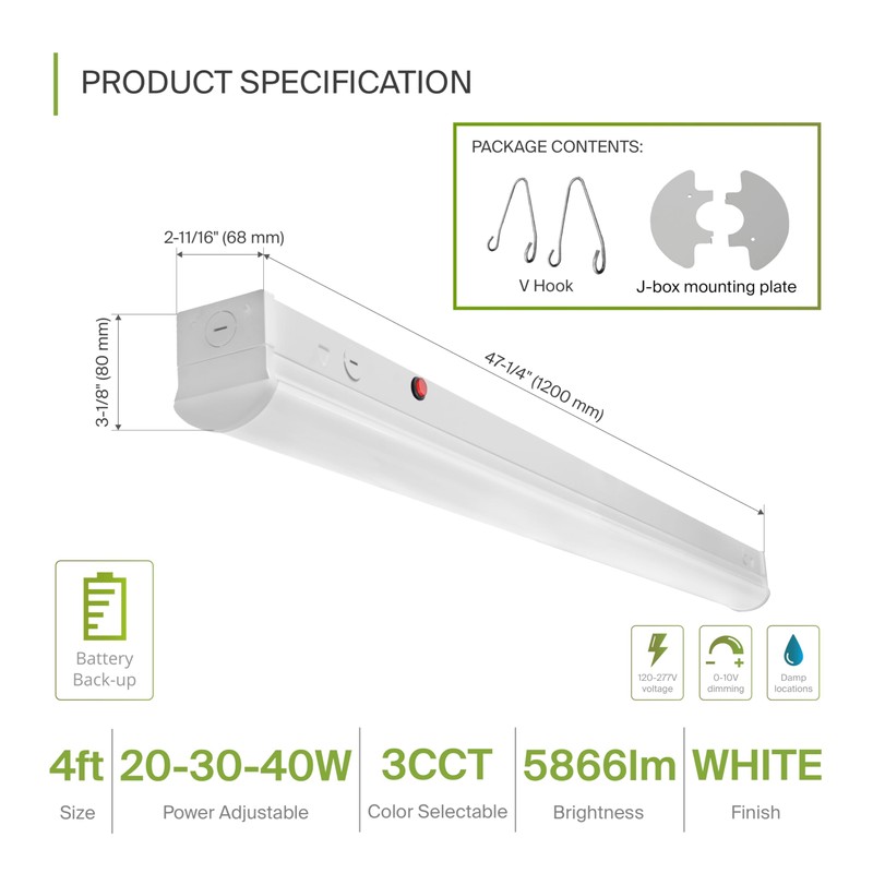 - MODERN DESIGN: LED STRIPLIGHT FIXTURE WITH EMERGENCY BATTERY BACK-UP has a narrow, low-profile design. Durable commercial grade housing resistant to rust and impact along with an anti-glare PMMA lens provide many years of use. Design of the fixture allows to connect multiple fixtures together with connection bracket. IThe fixture is designed to operate on 120-277V circuits with a 0-10V dimmable driver.