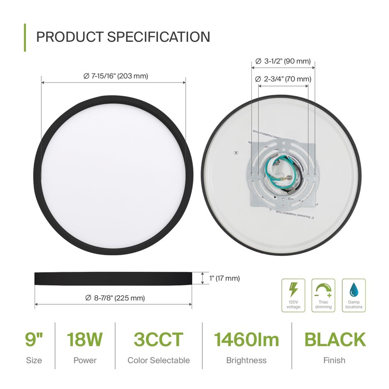ASD 9 Inch LED Flush Mount Ceiling Light Fixture - Matte Black 18W 3000K-5000K Adjustable Bright Dimmable Low Profile Kitchen, Bathroom, Hallway, Closet LED Lights - ETL & Energy Star