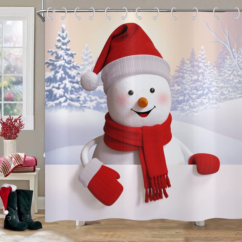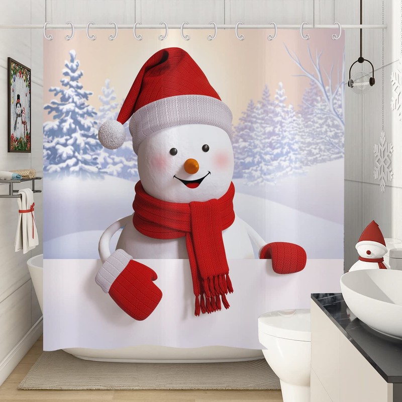 ASDCXZ Christmas Shower Curtain 180 x 200 cm, Cute Red Hat Snowman Skiing Snow Landscape Bathroom Washable Shower Curtains Polyester Textile Waterproof Shower Curtain for Bath with 12 Hooks