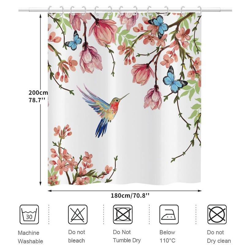 ASDCXZ Flowers Shower Curtain 180 x 200 cm, Spring Rose Flowers Green Leaves Blue Butterfly Colourful Bird Bath Washable Shower Curtains Polyester Textile Waterproof Bath Curtain for Bath with 12