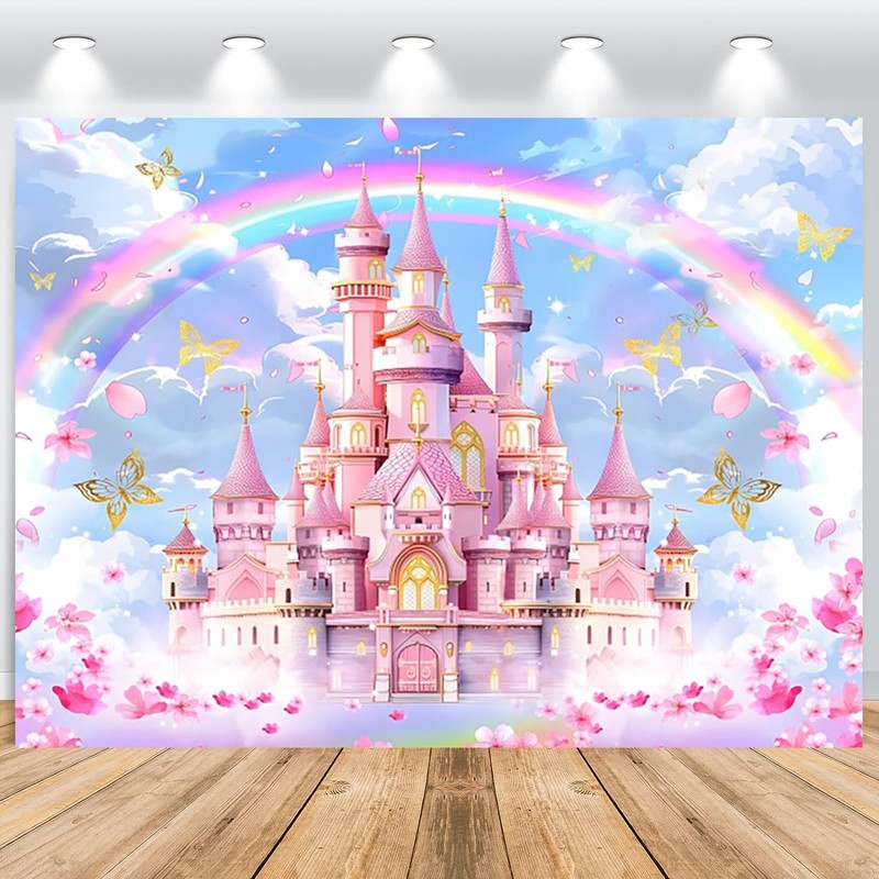 ASDCXZ Princess Castle Background 2.2 x 1.5 m, Pink Castle Rainbow Flowers Butterfly Photography Background for Princess Girls 1 Year Birthday Wedding Party Decoration Studio Props